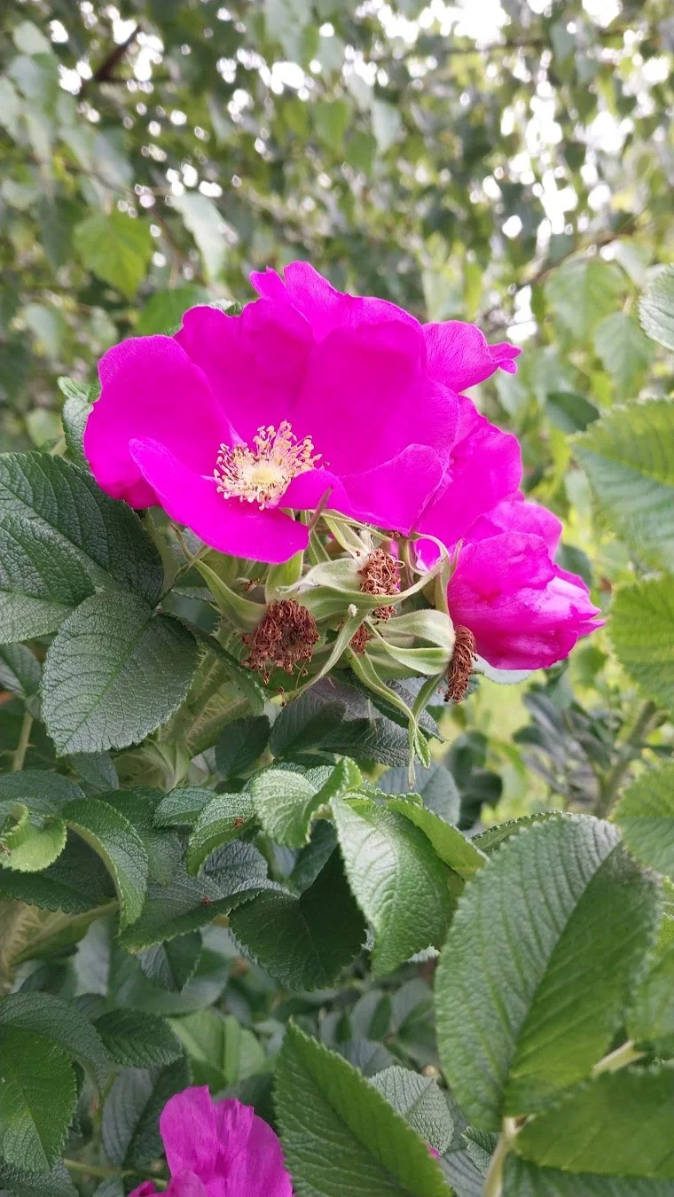 Like many herb gardeners in the US, Kasia grows plants from several continents. Native Eurasian/North African/European plants include mullein, raspberry, borage, sage, lemon balm, thyme, calendula, oregano, mugwort, hyssop, yarrow, marshmallow, nettle, hollyhock (which is edible and medicinal in addition to ornamental), and more. A raised bed of ashwagandha, popular in Indian Ayurvedic medicine, looked lush and healthy—as did the Asian Rosa rugosa bushes we spent hours weeding. I was surprised to hear that Kasia makes use of ashwagandha’s leaves; I had only learned to make remedies with the roots.